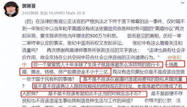 前妻指控 在杜星霖频繁怒怼网友的同时,张纪中的前妻樊馨蔓也展开了行动。樊馨蔓突然发了一篇长文,还配了两张房产过户的截图,指控张纪中在和她离婚前,就偷偷把名下资产转走了。 紧接着张纪中被湖南美猴王影业有限公司指控涉嫌职务侵占800多万元。该公司工作人员证实,朝阳经侦已受理并完成初步账目调查。 该公司法定代表人正是张纪中前妻樊馨蔓。张纪中则坚决回应:“这个100%属于前妻诬告,协议离婚多年,持续不断骚扰诬告。”
